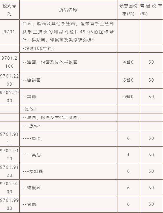 根據《中華人民共和國進出口稅則(2022版)》,繪畫作品的稅則號列和部分稅率如下(協定稅率及特惠稅率等詳見2022年稅則):